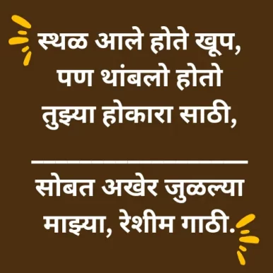 स्थळ आले होते खूप, पण थांबलो होतो तुझ्या होकारा साठी, __________________ सोबत अखेर जुळल्या माझ्या, रेशीम गाठी.