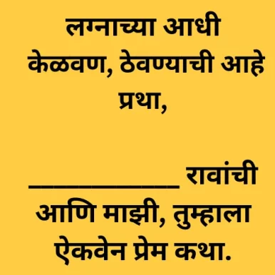 लग्नाच्या आधी केळवण, ठेवण्याची आहे प्रथा,____________ रावांची आणि माझी, तुम्हाला ऐकवेन प्रेम कथा.