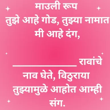 माउली रूप तुझे आहे गोड, तुझ्या नामात मी आहे दंग, ______________ रावांचे नाव घेते, विठुराया तुझ्यामुळे आहोत आम्ही संग.