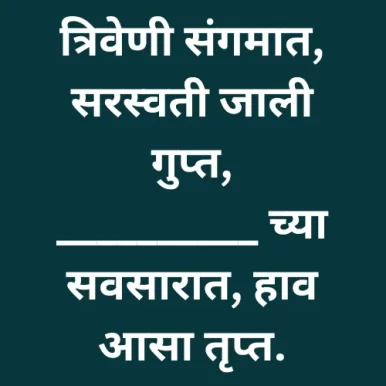 त्रिवेणी संगमात, सरस्वती जाली गुप्त, __________ च्या सवसारात, हाव आसा तृप्त.