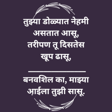 तुझ्या डोळ्यात नेहमी असतात आसू, तरीपण तू दिसतेस खूप ढासू, _______________ बनवशिल का, माझ्या आईला तुझी सासू.