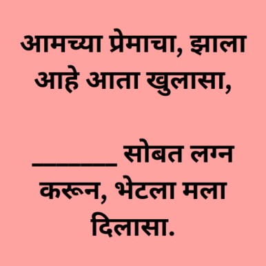 आमच्या प्रेमाचा, झाला आहे आता खुलासा, _______ सोबत लग्न करून, भेटला मला दिलासा.